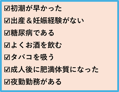これまでに乳がんにかかられた人たちに多く見られた生活習慣や環境にまつわる要件です